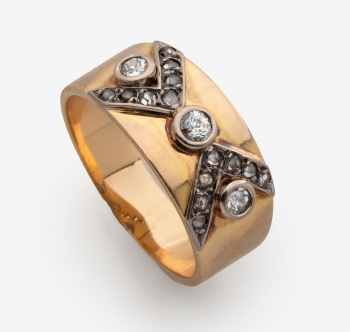 Sortija en oro amarillo con 3 diamantes talla brillante centrales y diamantes talla brillante en forma de puntas de flecha con un peso total de 0,20 cts. aprox. Peso: 7 grs. Nº Anillero: 17,5.