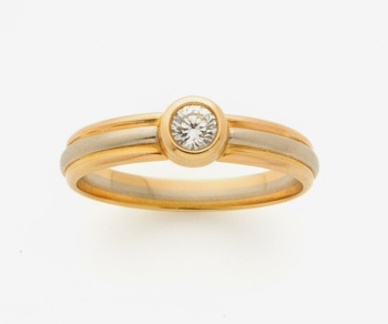 Solitario con brazo en oro amarillo, oro blanco y oro rosa con diamante talla brillante central con un peso total de 0,17 cts. aprox. Peso: 4 grs. Nº Anillero: 16,5.