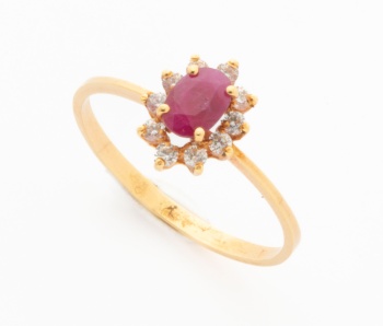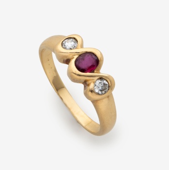 Sortija en oro amarillo con rubí central y 2 diamantes talla brillante a los lados con un peso total de 0,10 cts. aprox. Peso: 4,1 grs. Nº Anillero: 14.