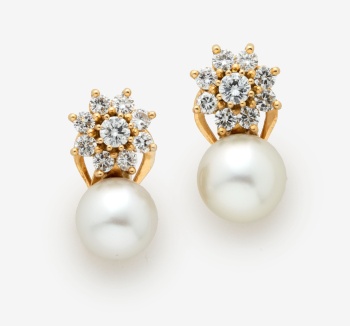 Pendientes en oro amarillo con diamante talla brillante central y orla en forma de flor con un peso total de 1,40 cts. aprox., y perlas australianas de 7 mm. aprox. Cierre omega.