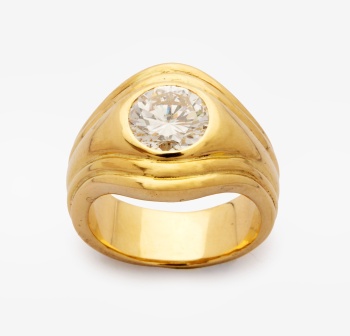 Sortija solitario en oro amarillo con diamante talla brillante central con un peso total de 1,12 cts. aprox. Nº anillero: 9,5.
