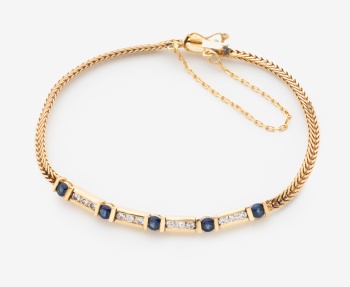 Pulsera en oro amarillo con 5 zafiros azules unidos por 4 filas de 3 diamantes talla brillante cada una, con un peso total de 0,25 cts. aprox. Peso: 8,6 grs.
