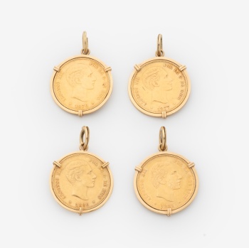 Conjunto de 4 colgantes con monedas en oro amarillo de 25 pesetas de Alfonso XII. de 1776, 1777, 1880 y 1881 cerco con garras. Peso: 43 grs.