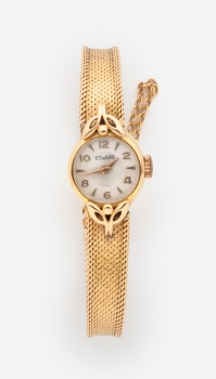 Reloj de señora con caja y pulsera en oro amarillo marca Duward. Esfera con números árabes. Cuerda. Peso: 18,20 grs.