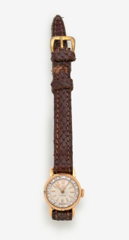 Reloj de pulsera de señora en oro marca Cyma con esfera blanca y correa en cuero. Peso: 4,20 grs.
