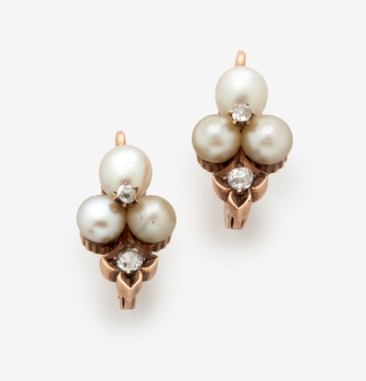 Pendientes en oro amarillo con diamantes talla brillante y perlas naturales representando flor con un peso total de 0,12 cts. aprox. Peso: 3,5 grs.