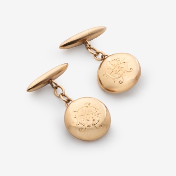 Gemelos en oro amarillo en forma de botón con iniciales "A. B." grabadas. Peso: 5,9 grs.