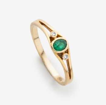 Sortija en oro amarillo con esmeralda central y 2 diamantes talla brillante a los lados con un peso total de 0,02 cts. aprox. Peso: 2 grs. Nº Anillero: 10,5.