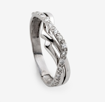 Sortija cruzada en oro blanco con diamantes talla brillante con un peso total de 0,22 cts. aprox. Nº Anillero: 14. Peso: 2,7 grs.