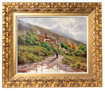 (Barcelona 1959) "Paisaje con personaje y casas " Firmado: R. Quiroga Óleo / Lienzo 60 x 73 cm. ; 92 x 104 cm. (con marco) Se adjunta certificado de autenticidad.