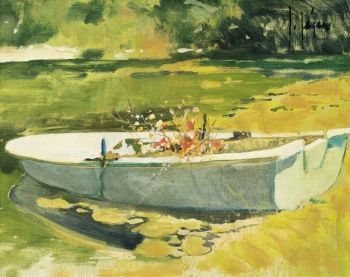 (1949) "Barca con flores" Firmado: I. Lázaro Óleo / Lienzo 33,5 x 41 cm. ; 53 x 61 cm. (con marco)