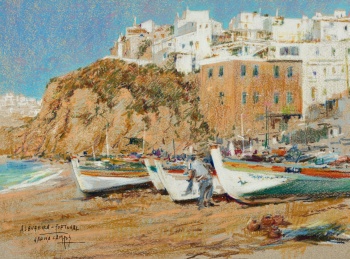 ( S. XX ) "Vista de Cadaqués con personajes" Firmado: Moles Ballesteros Pastel / Papel 49 x 64 cm. ; 76 x 91 cm. (con marco)
