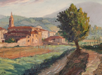 (Logroño 1913 - Bilbao 1995) "Paisaje rural vasco con casas e iglesia " Firmado: J.B. Óleo / Tabla 37 x 50 cm. ; 58 x 71,5 cm. (con marco)