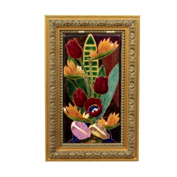 (Irún, Guipúzcoa 1897-1970) "Bodegón de flores" Firmado: J.G.G. LXVII Esmalte / Cobre con marco en madera dorada 37 x 20 cm. ; 50 x 32 cm. (con marco)