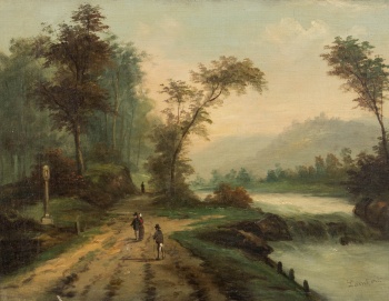 (S. XIX) "Paisaje con río y personajes" Firmado: Lambert Óleo / Lienzo 39 x 52 cm.