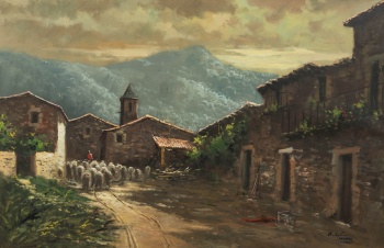 (Valencia 1940-2006) "Vista de pueblo con pastor y ovejas" Firmado: E. Beltran Messa Óleo / Lienzo 60 x 92 cm.