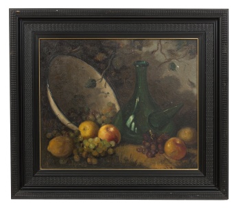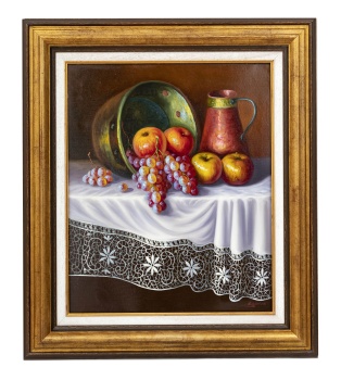 (S. XX) "Bodegón de uvas, manzanas y jarra " Firmado: A. Ceballos Óleo / Lienzo 61 x 50 cm. ; 82 x 71 cm. (con marco)