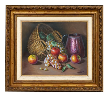 (S. XX) "Bodegón de cesta, uvas y manzanas " Firmado: A. Ceballos Óleo / Lienzo 50 x 61 cm. ; 80 x 91 cm. (con marco)