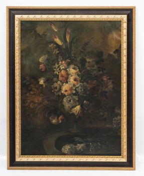 (Fin S. XIX - Pp. S. XX) "Bodegón de jarrón con flores" Oleo / Lienzo 111 x 83 cm. ; 128 x 102 cm. (con marco)