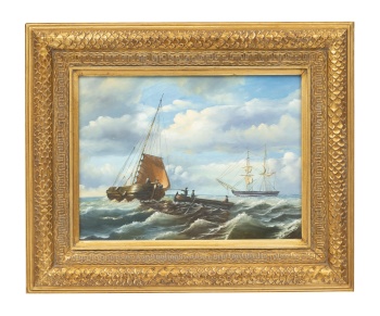 (S. XX) "Día de tormenta con barcos y personajes" Óleo / Lienzo 30 x 40 cm. ; 46,5 x 57 cm. (con marco)