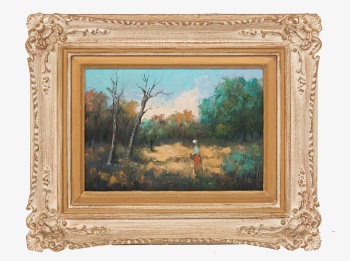 (1890-1985) "Paisaje con campesina" Firmado: M. Duval Óleo / Lienzo 19 x 27 cm. ; 33 x 41 cm. (con marco)