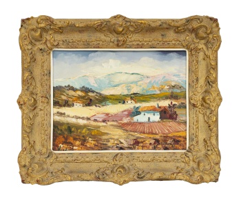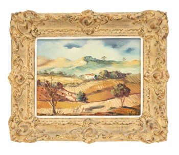 (S. XX) "Paisaje con casa y tierras" Firmado: Verdú Óleo / Lienzo 27,5 x 35,5 cm. ; 40 x 47 cm. (con marco)