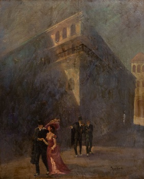 (S. XX) "Saliendo de la ópera" Firmado: Maya Cortés Óleo / Táblex 61 x 51 cm.