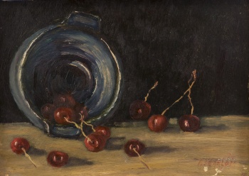 (Mediados S. XX) "Bodegón de cerezas" Firmado: Ilegible Óleo / Papel 15 x 21 cm. ; 37 x 43 cm. (con marco) (Con algun deterioro)
