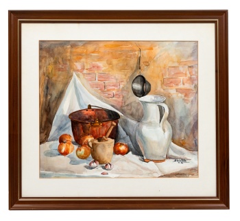 (S. XX) "Bodegón de cebollas, ajos, cobres y jarra" Firmado: B. de la Peña 11-88 Acuarela / Papel 50 x 59 cm. ; 71,5 x 80 cm. (con marco)