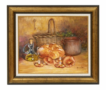 (S. XX) "Bodegón de hogaza de pan, aceite y setas " Firmado: Gumer Vila Óleo / Lienzo 54 x 67 cm. ; 75 x 86 cm. (con marco)