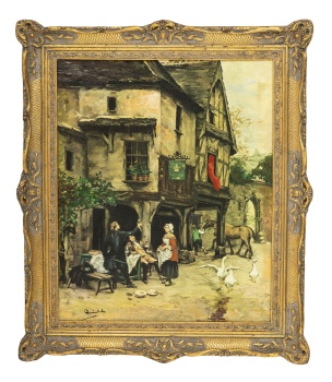 (Mediados S. XX) "Personajes en la Posada " Lamina / Lienzo 73 x 60 cm. ; 90 x 78 cm. (con marco)