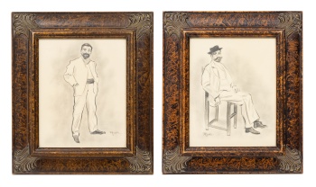 (S. XX) "Caballero posando ; Caballero con sobrero sentado" Firmado: J.M. Rovira Carboncillo / Papel (pareja) 24,5 x 19,5 cm. ; 36 x 31 cm. (con marco cada uno)