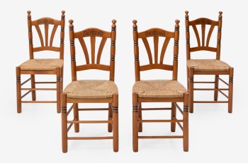 Conjunto de 4 sillas en madera de pino tallada con decoración de flores y asiento de enea. Estilo Luis XVI.