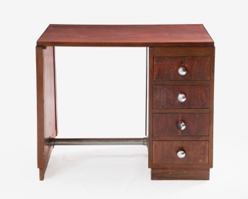 Mesa de despacho en madera de caoba con 4 cajones y barra central en metal.
