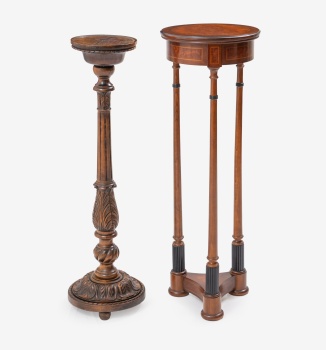 Lote compuesto por peana en madera de nogal tallado con decoración vegetal y peana en madera de caoba representando columnas. Estilo Regencia.