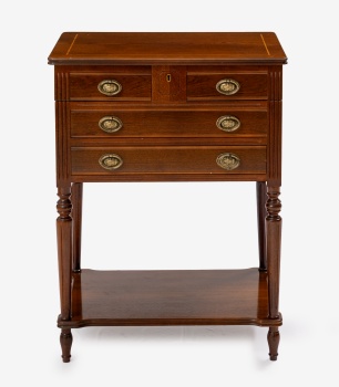Cubertero en madera de caoba tallada y marquetería con departamentos interiores y tiradores de bronce. Estilo Luis XVI.