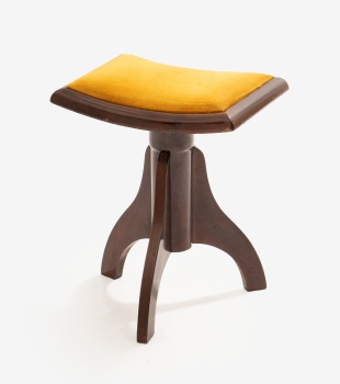 Taburete de piano en madera de caoba con asiento en pana mostaza. Estilo Regencia.