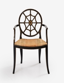 Butaca en madera lacada en negro y dorada con decoración vegetal. Estilo Chippendale.