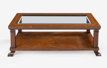 Mesa de centro en madera de caoba y marquetería con decoración geométrica, columnas y encimera en cristal biselado. Mariner. Estilo Regencia.