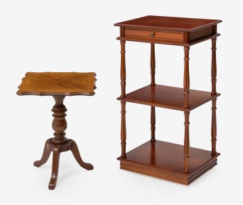 Lote compuesto por mesa pequeña en madera de raíz y mueble de baldas en madera de caoba con cajón superior rematando en ruedas.