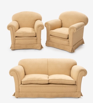 Conjunto de sofá de 2 plazas y pareja de butacas tapizadas en tela color oro viejo con decoración geométrica. Patas en madera.