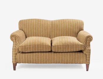 Sofá de 2 plazas con tapizado de rayas en tonos verdes y patas en madera.