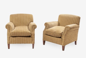 Pareja de butacas con tapizada de rayas en tonos verdes y patas en madera.