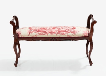 Pie de cama en madera de guinea tallada con decoración vegetal y asiento tapizado. Estilo Luis XV.