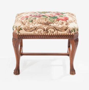 Escabel en madera de caoba tallada con decoración vegetal y patas de garra. Tapizado con decoración vegetal, flores, copas y tachuelas. Estilo Reina Ana