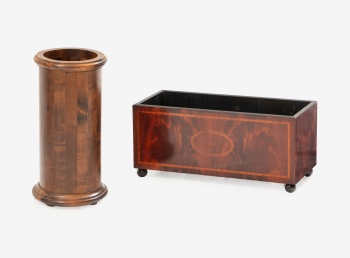 Lote compuesto por jardinera en madera de raíz y filo de marquetería y paragüero en madera de roble.