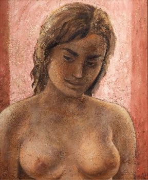 (Madrid 1930 - 2000) "Desnudo sobre rojo" Firmado: Waldo Óleo / Lienzo 29 x 30 cm. Al dorso titulado, firmado y fechado 1973