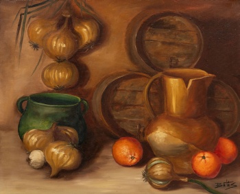 (S. XX) "Bodegón de cerámica, ajos y naranjas " Firmado: Betés Óleo / Lienzo 50 x 61 cm.; 65,5 x 76 cm. (con marco)