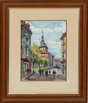 (Barcelona 1942) "Vista de Iglesia con personajes " Firmado: Chicharro 81 Acuarela / Papel 32,5 x 24 cm. ; 54,5 x 46,5 cm. (con marco)