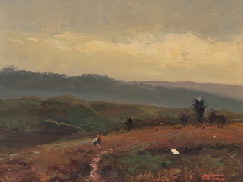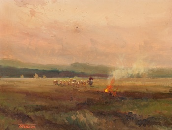 (Sant Feliu de Pallerols, Gerona 1962) "Paisaje con hoguera, pastora y ovejas" Firmado: F. Colomer Óleo / Lienzo 27 x 35 cm.